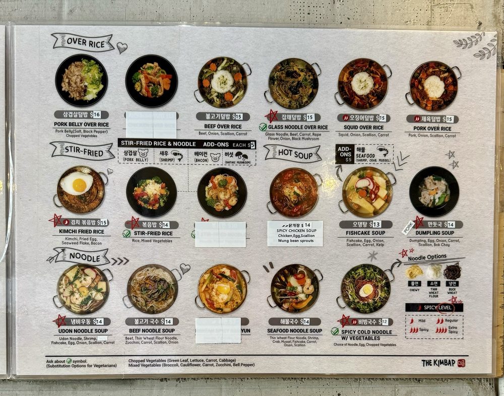 “ I came in at 6:20, at this point of the night they close the dining area and are only open for takeout but that worked for me. I was able to place my order the moment the host was done calling out order names. I had ordered the Spicy Squid Kimbap and it's a decent size for $9 and even though it's marked among the hotter items it was just as sweet and tangy as it was hot, with no fishy smell or taste. Quick, cheap, delicious, easy, 10/10 ”